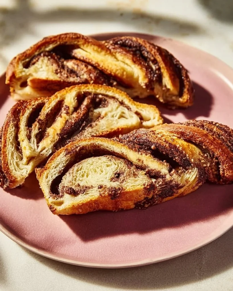 2. Roll the dough tightly into a log shape and slice it in half lengthwise to reveal the filling. Twist the two halves together to form a braid.