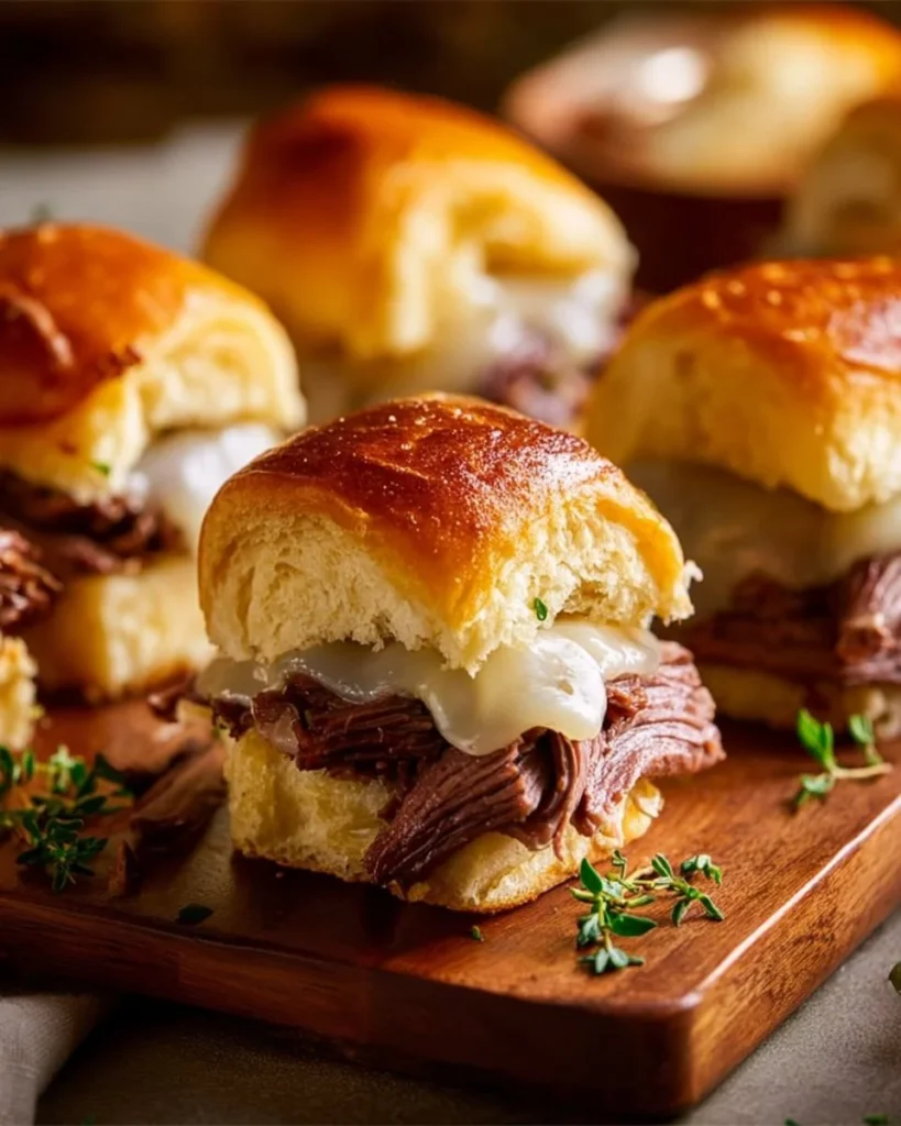 Serve the sliders hot and fresh from the oven. Place a small bowl of warm au jus next to each serving plate. Let guests dip each slider into the broth for a moist bite. Add a small side of pickles or thinly sliced red onion for a fresh bite. Offer napkins—these sliders are juicy and hands-on. For a full meal, add a light salad and roasted vegetables.