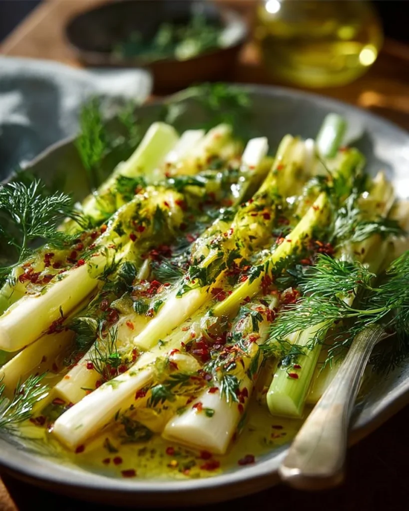 A healthy and flavorful side dish combining tender leeks with a zesty mustard and dill dressing.