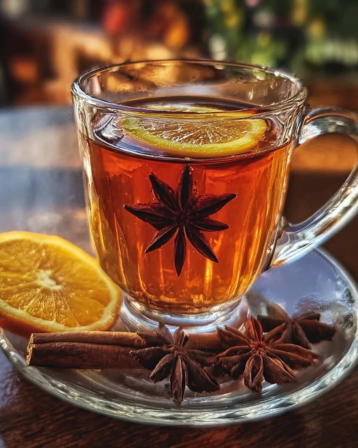 - Pour the tea into mugs. If desired, garnish with a fresh orange slice and a cinnamon stick for extra flavor and presentation. Enjoy!