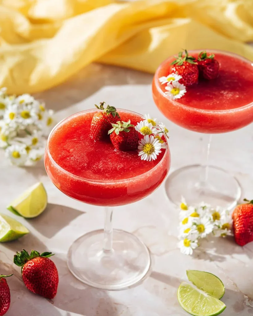 - Pour into glasses and garnish with fresh strawberries and a lime wedge.